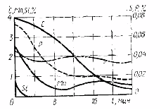 Изменение металла по ходу плавки показано (на рис. 2). При продувке происходит окисление углерода и других примесей как непосредственно кислородом дутья, так и оксидом железа FeO. Одновременно образуется активный шлак с необходимым содержанием СаО, благодаря чему происходит удаление серы и фосфора с образованием устойчивых соединений P2O5- ЗСаО и CaS в шлаке.