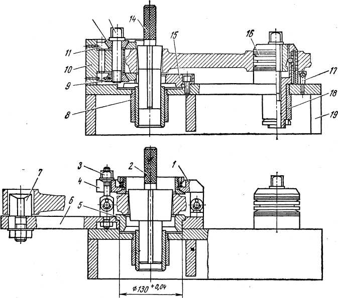 / — прижим; 2, 14 — съемные пальцы; 3 — накидная гайка; 4 — планка; 5, 15 — установочные втулки; 6, 10 — съемные приставки; 7 — палец срезанный; 8, 18 — направляющие втулки; 9, 12 — конусные шайбы; 11 — при хват; 13 — болт; 16 —* установочный палец; 17 — упор; 19 — корпус