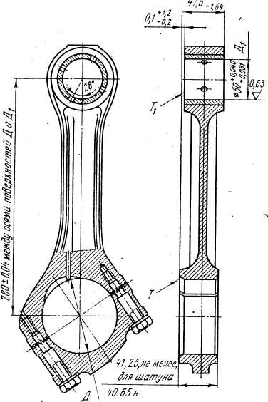 В нижней головке шатуна имеется отверстие диаметром 93+0'021 мм под вкладыши подшипников, в верхней головке —отверстие диаметром 56+0'03 мм под бронзовую втулку. Внутренняя поверхность втулки окончательно обработана до диаметра 50+0.040 мм после запрессовки в отверстие верхней головки шатуна, при этом колебание размера для одного шатуна должно быть не более 0,004 мм.