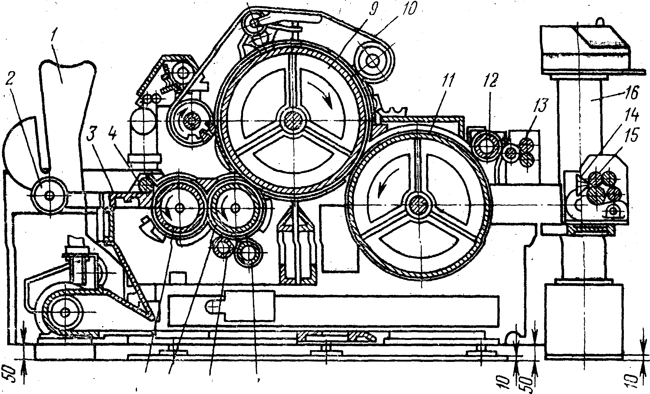 На чесальных машинах обычных габаритных размеров используются два шляпочных полотна. Этим достигается улучшение эффекта разделения волокон, которое обычно получают двойным чесанием. Применение давильных валов на чесальных машинах позволяет дробить крупные сорные примеси, которые затем удаляются при вытягивании на ленточных машинах.