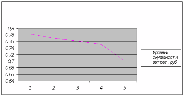 Необходимым условием регулирования рыночных отношений является составление надежных прогнозов развития социально-экономических явлений. Для этого используется метод экстраполяции. Экстраполяция – нахождение уровней за пределами изучаемого ряда. Зная уравнение для теоретических уравнений и подставляя в него значения t за пределами исследуемого ряда рассчитывают вероятные Уt. Рассчитаем для 2003 г. вероятный уровень окупаемости затрат: Уt = 0,71 + 0,06*4=0,95 руб.