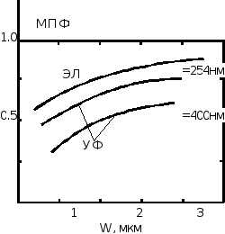 МПФ контактной печати очень высока (0.8), и при использовании соответствующего контактного шаблона или двухслойных резистов могут быть получены изображения размером вплоть до 0.1 мкм. При использовании ДУФ-излучения метод печати с зазором позволяет получать в ПММА рисунки с шириной лини 1 мкм. Если зазор Z между шаблоном и пластиной превышает френелевский предел (5%-ный допуск для интенсивности и 20%-ный допуск для ширины линии), предельное разрешение W составляет 1-2 мкм для зазора 5-10 мкм: