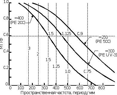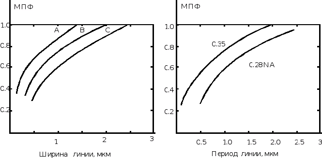 МПФ оптических приборов резко спадает на пространственной частоте, которая ограничивает диапазон пространственных частот изображаемого предмета. При увеличении NA и уменьшении улучшается качество передачи изображения (рис. 6). Расфокусировка может рассматриваться как аберрация. Таким образом, использование тонких пленок в многослойном резисте или резисте с поверхностным переносом изображения позволяет увеличить разрешение, особенно в случае близко расположенных линий или элементов.