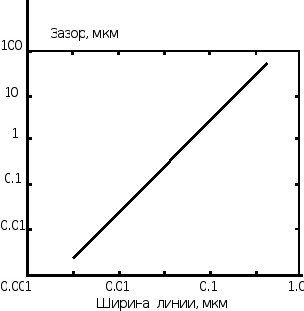 Рис. 24. Зависимость ширины проявленной линии от расстояния между поверхностью резиста и рентгеновским шаблоном.