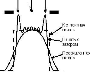 Оптическая литография объединяет в себе такие области науки, как оптика, механика и фотохимия. При любом типе печати ухудшается резкость края (рис. 1). Проецирование двумерного рисунка схемы ведет к уменьшению крутизны края, поэтому нужен специальный резист, в котором под воздействием синусоидально модулированной интенсивности пучка будет формироваться прямоугольная маска для последующего переноса изображения травлением или взрывной литографией.