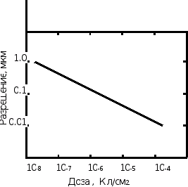 Величина К=0.3 в случае записи рисунка в верхний поверхностный слой, 0.5- в верхний промежуточный слой (многослойные резисты), 0.8- во всей толщине однослойной резистной пленки. Основные направления увеличения разрешения заключается в уменьшении толщины чувствительного слоя, по крайней мере, до четверти величины минимального требуемого размера (разрешения).