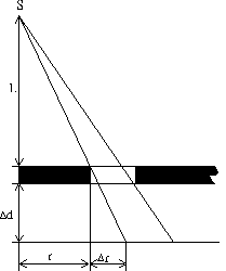 В рентгеновской литографии шаблон при совмещении помещается над пластиной с зазором 10 мкм для увеличения его срока службы. Поскольку длина волны рентгеновского излучения мала, можно пренебречь дифракционными эффектами и оперировать простыми геометрическими представлениями при формировании рисунка на шаблоне. Непрозрачные участки шаблона затеняют пластину под шаблоном, но край тени получается не совсем резким из-за конечных размеров (S) источника рентгеновского излучения (диаметр пятна сфокусированных на аноде электронов), находящегося на расстоянии D от шаблона. Если зазор между шаблоном и пластиной обозначить через g, то ширина области полутени равна :