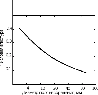 Рис. 2. Зависимость числовой апертуры объектива от размера поля изображения