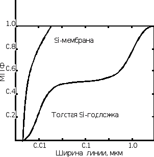 Поскольку в качестве шаблона используется сплошная полупрозрачная мембрана, то, по крайней мере, 50% излучения поглощается шаблоном. Для сбалансированности между контрастностью проходящего пучка и временем экспонирования (интенсивность) лишь малая часть рентгеновского излучения должна проходить сквозь непрозрачные участки шаблона. Минимальный контраст между прозрачным и непрозрачным участками шаблона для экспонирования резиста составляет 4:1 (модуляция 60%). Вторичные электроны, испускаемые поглощающими элементами из золота, могут вызывать “размывание” края изображения. Для ослабления эмиссии вторичных электронов применяется покрытие из полиимида поверх золотого рисунка, поглощающее выбитые фотоэлектроны, иначе уход размера может достигать 0.2-0.4 мкм. При взаимодействии рентгеновского излучения с подложкой вторичные фотоэлектроны, имеющие небольшую длину пробега, рассеиваются в обратном направлении, что может вызывать уширение основания изображения в позитивном резисте.