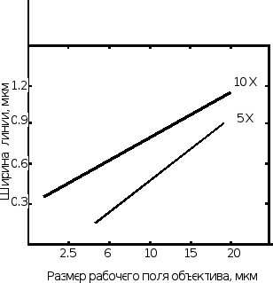 Степперы обладают лучшей точностью совмещения, в них используются более дешевые шаблоны и существующие позитивные резисты, экспонируемые в спектральном диапазоне 365-435 нм. Однако производительность степперов ниже производительности оптических сканеров. Главное преимущество степпера 10:1 заключается в уменьшении влияния неточности фотошаблона до несущественных значений и в более высоком разрешении по сравнению с объективами с 5- кратным уменьшением. С другой стороны, жертвуя разрешением в системе 5:1, получаем выигрыш в существенно большем размере поля изображения (рис. 9). Для кристаллов ИС небольших размеров метод проекционной печати позволяет воспроизводить элементы в резисте с минимальными размерами вплоть до 0.1 мкм.