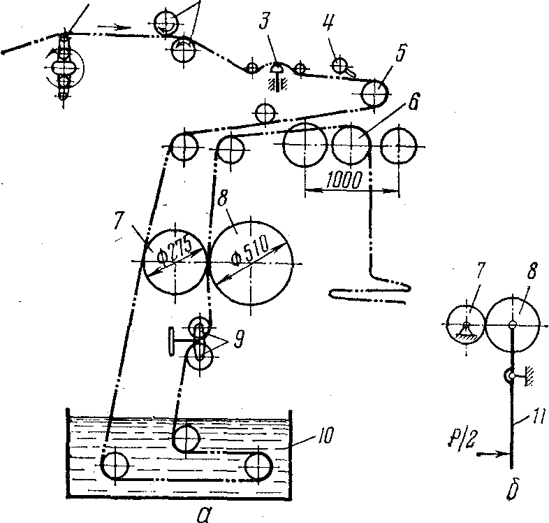 На рис. 1, а показана схема отжимной машины КВ-120 для полотна, в состав которой входят ванна, отжимные валы, выборочное устройство и жгуторасправитель. При работе в составе линии выборочное устройство снимается, модернизируется привод и вводятся механизмы для агрегирования каландра с другими машинами.