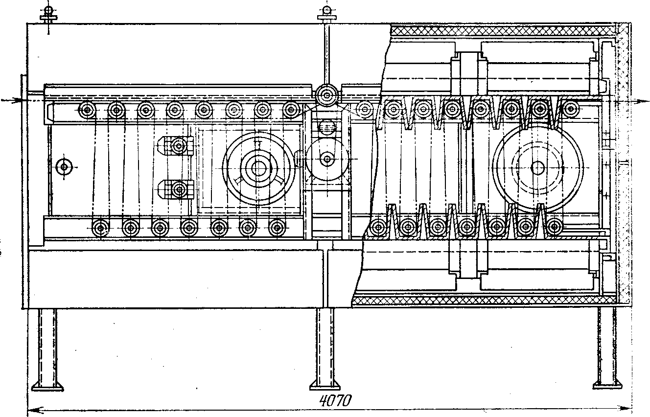 Термокамера состоит из двух секций, между которыми установлены роликовые компенсаторы 6. Привод машины осуществлен по системе Г—Д с плавной регулировкой скоростей; верхние ряды роликов приводные. В средней части камеры установлены два вентилятора и электрокалорифер.