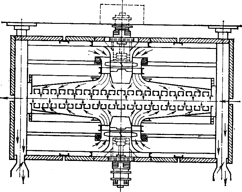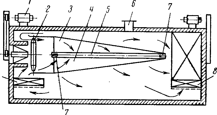 Циркуляция воздуха в СШМ производится 'осевым или центробежным вентилятором. Существует много различных циркуляционных систем, но каждая из них обеспечивает двусторонний сопловой обдув ткани. Более рационально располагать вентиляторы сбоку, так как в этом случае сокращается зона разрежения, соприкасающаяся с внешними стенками сушильной камеры, что способствует уменьшению подсоса холодного воздуха и, кроме того, не загромождается доступ к внутренним частям машины. На рис. 16 показана схема циркуляции воздуха в зоне сушилки СШМ с боковым расположением осевого вентилятора 2, приводимого в движение электродвигателем 1.