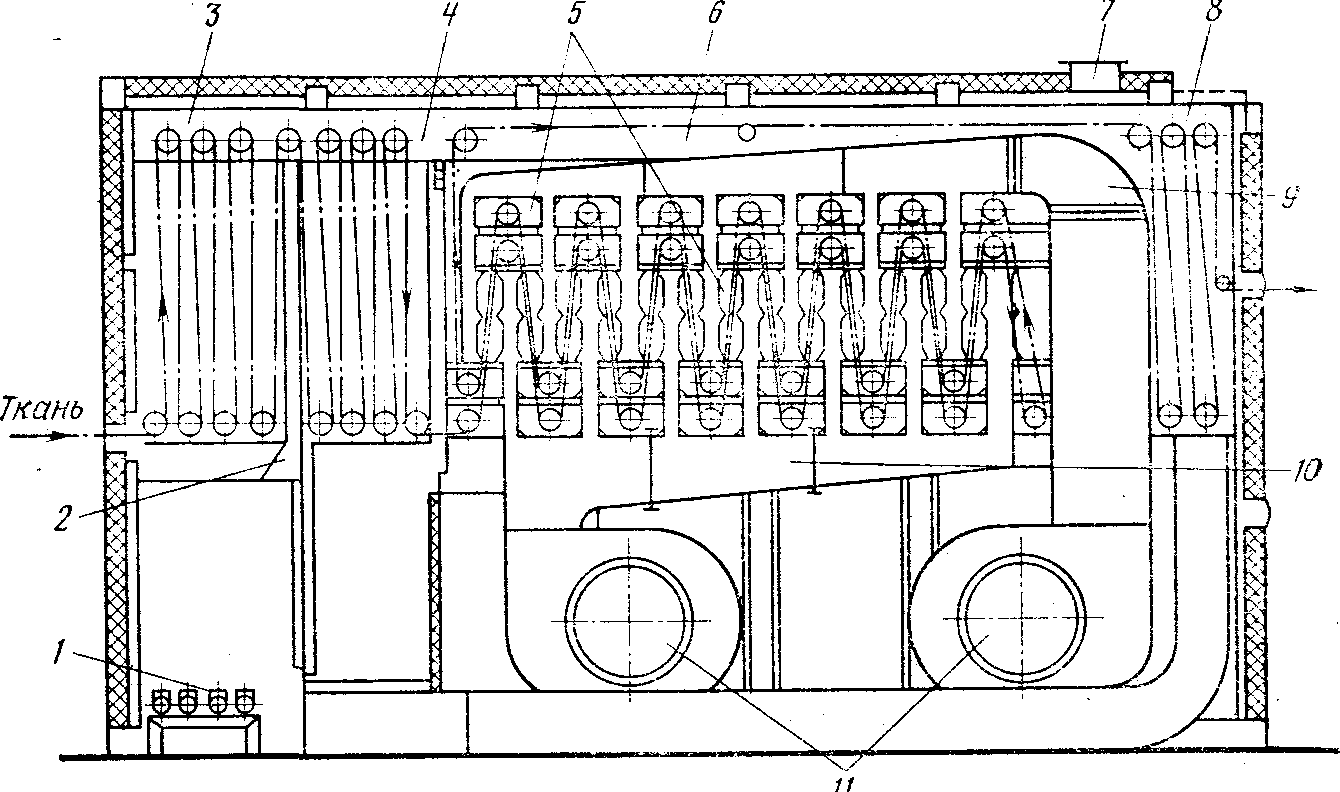 В машине применены горелки 1 с короткой длиной факела и керамическими стабилизаторами, которые являются эффективными теплоизлучателями. Сгорание газа и смешивание его с воздухом происходит непосредственно под роликами, что обеспечивает равномерное распределение теплового потока по всей площади и предупреждает возможность местного перегрева ткани. Сушильная камера роликового типа состоит из трех сушильных зон 3, 4 и 6 и одной зоны охлаждения 8. Первая зона размещена над камерой смешивания продуктов сгорания с воздухом, вторая отделена от первой пустотелой перегородкой 2, в нее поступает газовоздушная смесь из первой зоны и пустотелой перегородки. Под второй зоной расположена камера, в которой смешиваются газовоздушные смеси, поступающие из первой, второй и третьей зон. Циркуляция газовоздушной смеси осуществляется четырьмя центробежными вентиляторами 11, расположенными по два с каждой стороны. Газовоздушная смесь поступает в них через сетчатые фильтры и нагнетается в верхний 9 и нижний 10 коллекторы, из которых распределяется в сопловые камеры 5 со щелями для обдувки ткани в третьей зоне, в которой ткань заправлена по способу петля в петле. На этом же участке имеет место радиационная отдача тепла от стенок коробов.