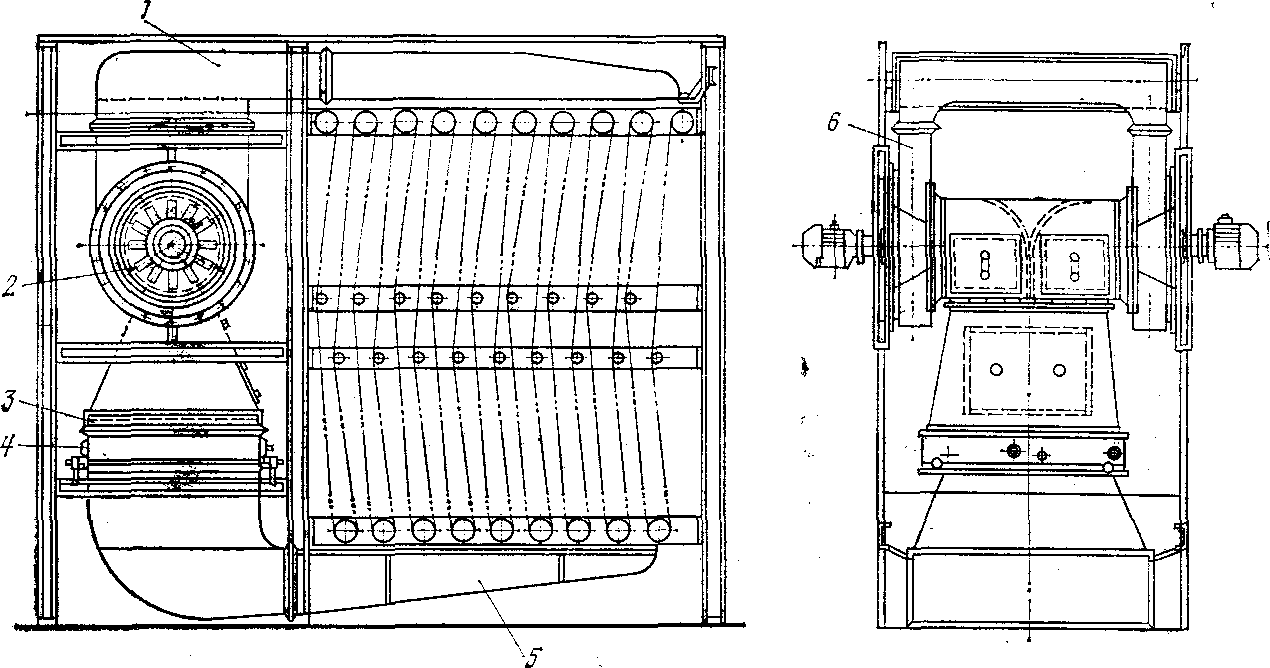 Проводка ткани осуществляется в сушильной камере по двум рядам роликов / наклонными петлями, а за счет увеличения расстояния между роликами установлены сопловые короба 2, которые располагаются вдоль полотна ткани с двух сторон. Машина состоит из шести однотипных секций, каждая из которых имеет свой тепловентиляционный блок, состоящий из четырех сопловых коробов V-образной формы, двух осевых вентиляторов 6 и двух калориферов 5.