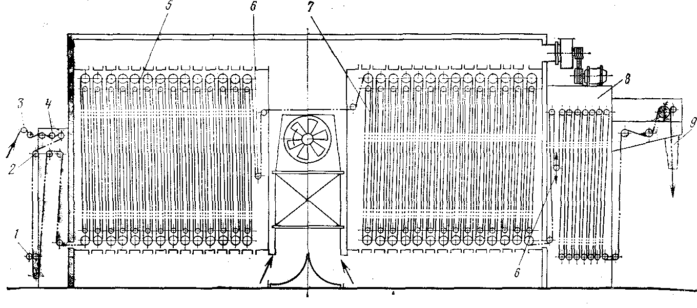 Сушилка имеет три секции, между которыми установлены роликовые компенсаторы, осуществляющие плавное регулирование скорости движения ткани при натяжении не более 196 Н. Сравнительно невысокое натяжение ткани в машине позволяет использовать ее для сушки шелковых тканей. В начале каждой Секции устанавливаются тепловентиляционные блоки 2, направляющие поток воздуха через пластинчатые калориферы 4 в короба воздухопроводов — нижний напорный 5 и верхний всасывающий .1, последний при подходе к вентилятору раздвигается на два боковых короба 6, между которыми проходит ткань.