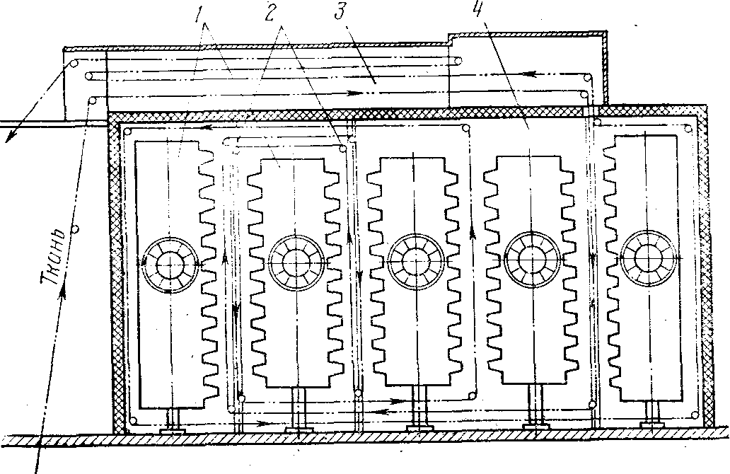 Более высокую плотность заправки имеют сопловые сушилки с вертикальной проводкой ткани. В СССР такого типа машины СП-120-1 выпускались для сушки напечатанных тканей, которые следует высушить, не допустив смазывания краски, что удается при помощи П-образной проводки ткани со спиральной заправкой. Схема сушилки представлена на рис. 9. Она представляет собой камеру 4, выполненную из металлических щитов, заполненных стекловолокном. На опорах крепятся направляющие ролики 2, между которыми установлены сопловые короба 1. В камере сушилки расположены пять тепловентиляционных блоков, имеющих по одному осевому вентилятору и по два пластинчатых калорифера на каждый короб с соплами. Пар подводится отдельно к каждому калориферу, но конденсат отводится одним общим горшком, однако паро- и конденсатопроводы выполнены так, что обеспечивается продувка каждого тепловентиляционного блока. В состав сушилки также входят: охладительная камера 3, тянульная пара, поворотное устройство и роликовый укладчик (на рисунке они не показаны).