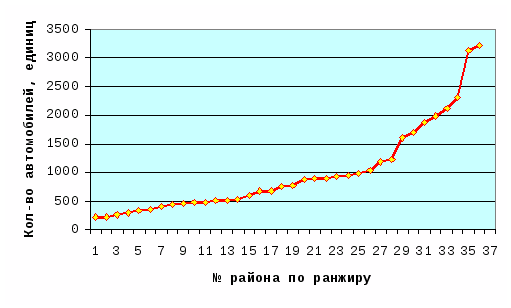 Для начала построим ранжированный ряд по одному из признаков – в нашем случае в качестве примера возьмём наличие автомобилей по 36 районам тверской области (без учёта индивидуальных владельцев) за 2004 год (см. Табл. 10). Графически изобразим изменения значений признака с помощью огивы распределения: