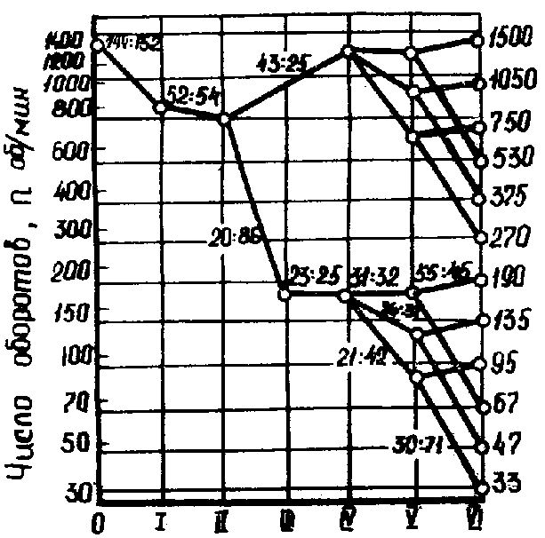 Номера валов обозначаются римскими цифрами, числа зубцов шестерён и колёс – арабскими.