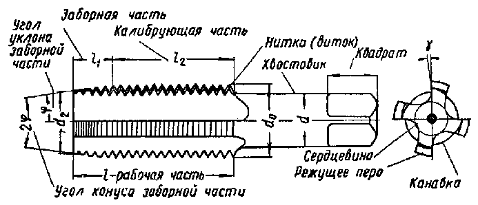 = 5…10, такая заточка обеспечивает отвод стружки в направлении подачи метчика.