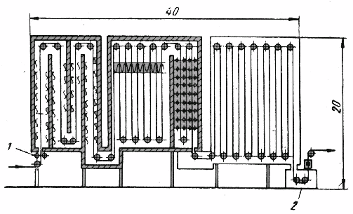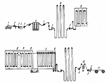 8 — петлевые ямы; 9 — башенная печь; 10 — установка Для нанесения защитного покрытия; 11 — моталка.