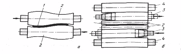 а — вариант применения «бутылочных» рабочих валков; б — вариант смещения промежуточных валков; 1 — прокатываемая полоса; 2,3,4— соответственно рабочие, промежуточные и опорные валки.