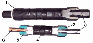 1 – изолированная гильза для фазных проводов; 2 – край оболочки, срезанной с конца СИП; 3 – алюминиевые провода СИП; 4 – изолированная гильза для абонентских ответвлений; 5 – герметизирующая цветная заглушка; 6 – медная многопроволочная изолированная жила |