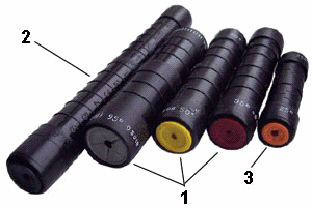 На рис. 2 показаны срезы на двух смонтированных изолированных гильзах. Кроме изолированных гильз для многопроволочных жил в абонентских ответвлениях, имеются также изолированные гильзы для соединения в ответвлениях многопроволочных жил с однопроволочными. Их предлагает лишь Simel. Они объединены в серию MJPBAS и имеют обозначения: MJPBAS 10–35М, MJPBAS 16–16М, MJPBAS 25–35М, где первое число в обозначении – это сечение многопроволочной жилы, а второе – однопроволочной в мм2. Типоразмерный ряд этих гильз перекрывает следующие комбинации сечений соединяемых проводов (правое число – сечение однопроволочной жилы): 10–25, 10–35, 16–16, 16–25, 16–35, 25–16, 25–25, 25–35, 35–35 мм2, с прочностью 60% от прочности проводов.