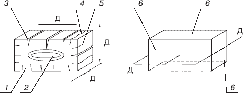Рис. 2.7. Сушка кирпича сырца: а – без обработки; б – с обработкой наружных граней влагозадерживающими составами. Д – направления действия усадочных деформирующих сил. 1 – кирпич сырец; 2 – ядро уплотнения со свилевыми трещинами; 3 – разрывные трещины; 4 – волосяные трещины; 5 – угловые трещины; 6 – обработанные грани.