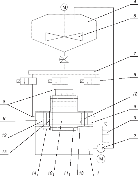 Рис. 2.8. Схема установки ШЛ 347: 1 – смеситель; 2 – эмульгатор; 3, 6 – электрогидроклапан; 4 – накопитель; 5 – мешалка лопастная; 7 – коллектор; 8 – сопло; 9 – валик подающий; 10 – брус глиняный; 11 – ролик приводной; 12 – валик дозирующий; 13 – валик контактирующий; 14 – измерительный блок.