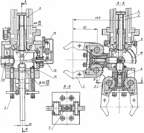 Смена позиций схватов производится при вращении шпинделя 8 от отдельного привода механизма кисти руки (на рисунке не показан), через коническую шестерню 9 и зубчатый сектор 10, который жестко закреплен на корпусе 11. При вращении шпинделя 8 корпус 11 поворачивается относительно оси 12 на угол 90° в необходимом направлении. Контроль зажима губок схвата 2 осуществляется датчиком 13 рычажного типа, который воздействует на микровыключатель 14.