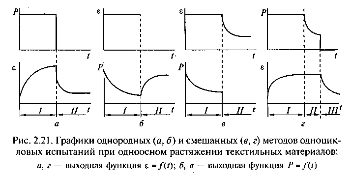 Из одноцикловых характеристик, получаемых при растяжении текстильных материалов, наибольший интерес представляет изучение релаксации напряжения, или деформации, и определение полного удлинения и его составных частей. При изучении релаксации напряжения (усилия) регистрируют величину усилия при заданном постоянном удлинении (см. рис.1, б). По степени уменьшения напряжения за определенное время делают сравнительную оценку материалов. Следует отметить, что проявление релаксации напряжения у тканей имеет почти одинаковый характер, поэтому эта характеристика не получила широкого распространения.