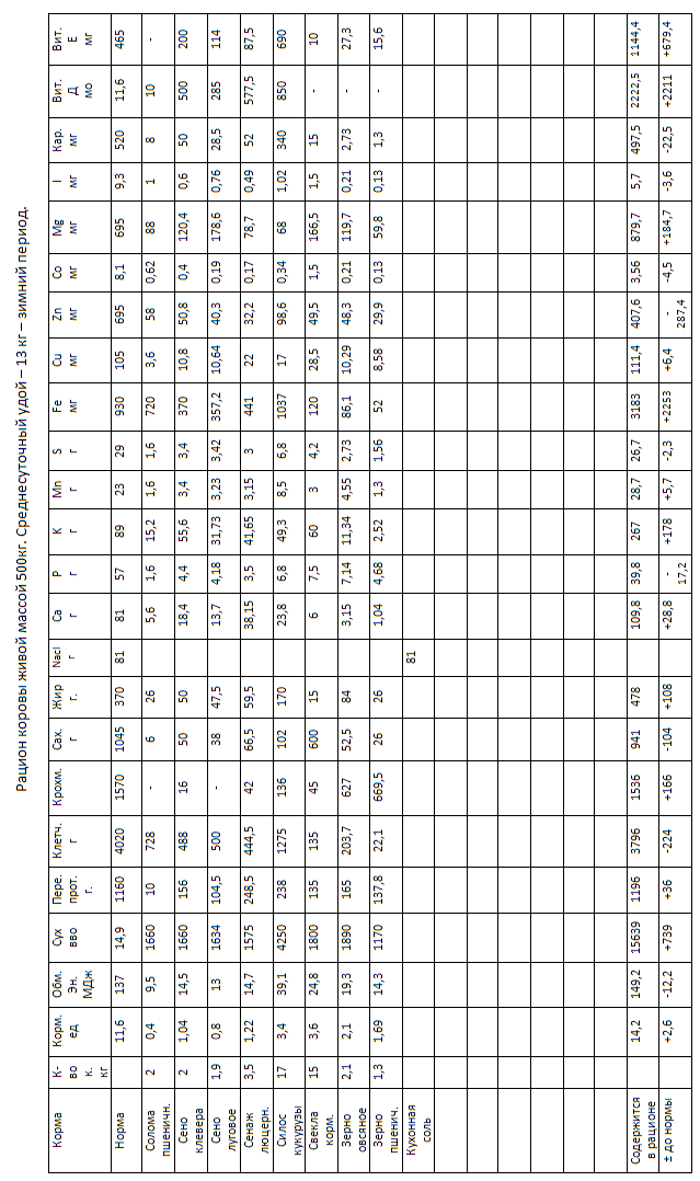 В летнем рационе видно что недостаток единиц энергии, обм. энергии, сухого вещества, клетчатки, крахмала, сахара, жира, фосфора, магния, серы, цинка, кобальта, йода. В зимнем рационе – наблюдается избыток кормовых единиц. Также наблюдается недостаток обмена энергии, клетчатки, сахара, а так же некоторых микроэлементов. Для восполнения недостатков в рационе необходимо добавлять в рацион добавки: комбикорма, мочевину, мелассу, динатрий фосфат, углекислый цинк, сернокислая медь, сернокислый марганец, йодистый калий. Для восполнения недостатка клетчатки требуются дополнительные грубые корма. Также требуется добавление в суточные рационы поваренной соли.