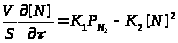 Як показали результати проведених експериментів по вивченню розчинення азоту в рідких ніобії, ванадії, цирконії і титані, стадією, що лімітує процес абсорбції азоту є хіміко-адсорбційна ланка в газовій фазі на поверхні рідкого металу. Кінетика такого процесу описується рівнянням другого порядку. У нашому випадку, коли процес масопереносу азоту лімітується другою стадією і, зокрема швидкістю дисоціації молекул на поверхні розплаву, то кінетичне рівняння буде мати вид: