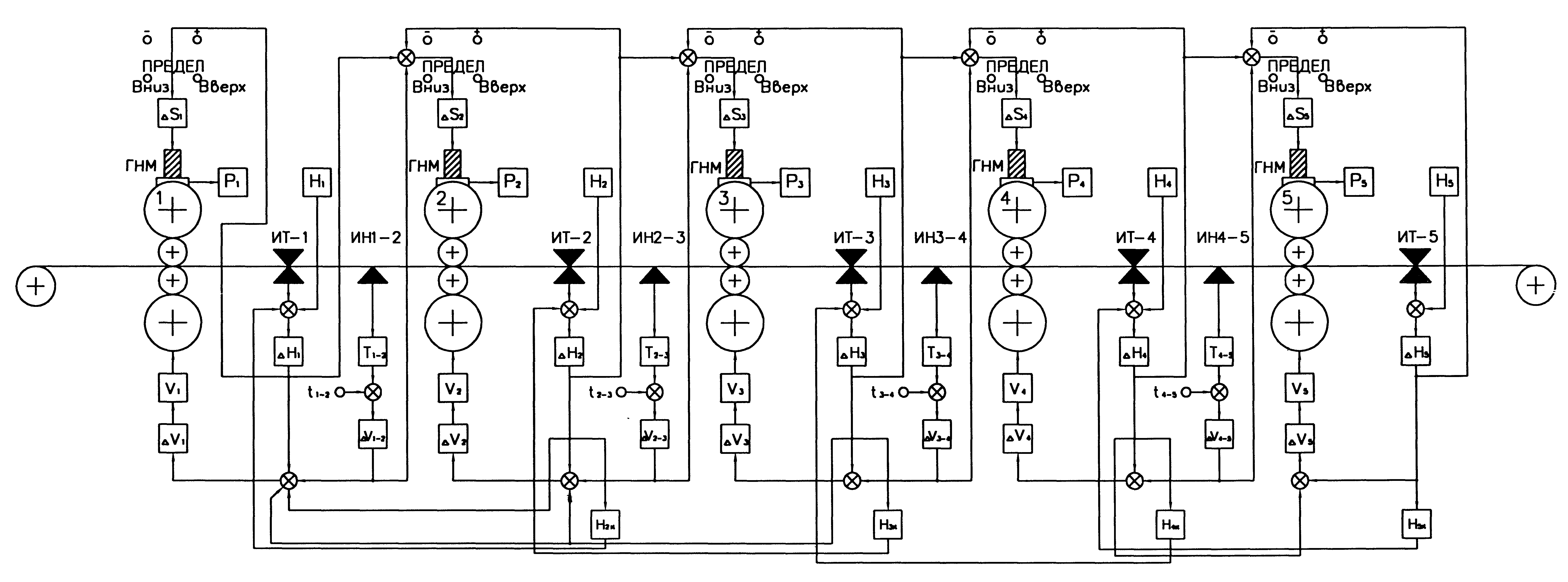 Рисунок 2. - Структурная схема основных воздействий регулирования комплекса САРТ и Н 5-кл. стана "630": ГНМ - гидравлический нажимной механизм; ИТ - измеритель толщины; ИН - измеритель натяжения; Н1, Н2, Н3, Н4, Н5 - уставки толщины; t - уставка натяжения;