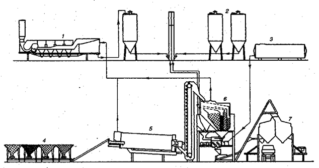 1 — агрегат пылеулавливания; 2 — агрегат минерального порошка; 3 — битумоплавильный агрегат; 4 — агрегат питания; 5 — сушильный агрегат; 6 — смесительный агрегат; 7 — накопительный бункер
