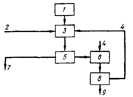 Схема процесса выделения молибдена из отработанных кислых растворов, образующихся при производстве вольфрамовых нитей накаливания: 1 - раствор 40-75 г/л молибдена в 15 н. кислоте; 2 - аммиак; 3 - установка рН = 2-i - 3 н перемешивание в течение 10 ч при температуре 70-80 °С; 4 - промывная вода; 5 - декантирование; 6 - промывка; 7 - маточный раствор; 8 - фильтр; 9 - высокочистый продукт азотной кислоты.