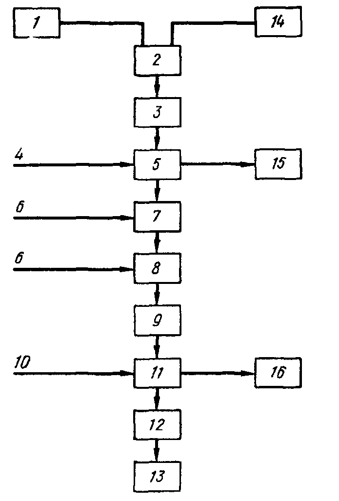 Схема процесса выделения молибдена из отработанных катализаторов: 1 - раствор Na,CO>s>; 2 - импрегнирование; 3 - спекание; 4 - горячая вода; 5 - растворение; 6 - концентрированная HNO>a>; 7 - нейтрализация; 8 - отстаивание; 9 - осаждение; 10 - 1% -ный раствор HNO,; 11 - фильтрация и промывание; 12 - сушка; 13 - сухая молибденовая кислота; 14 - отходы; 15 - удаленный твердый продукт; 16 – промывная.