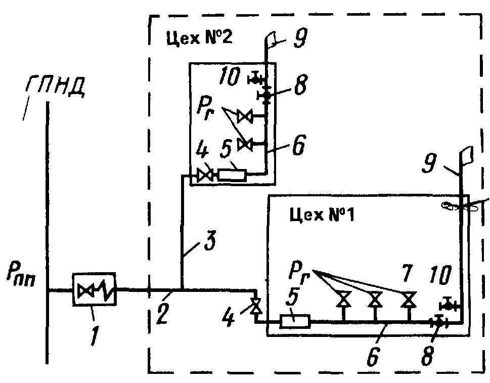1-отключающее устройство (задвижка), 2 – межцеховой газопровод, 3 – ответвление к цеху, 4-отключающее устройство на вводе в цех, 5-пункт измерения расхода газа (ПИРГ), 6-внутрицеховые газопроводы, 7-главное отключающее устройство перед агрегатами, 8-кран на продувочном газопроводе, 9-продувочный газопровод, 10-штуцер с краном и пробкой для взятия пробы.