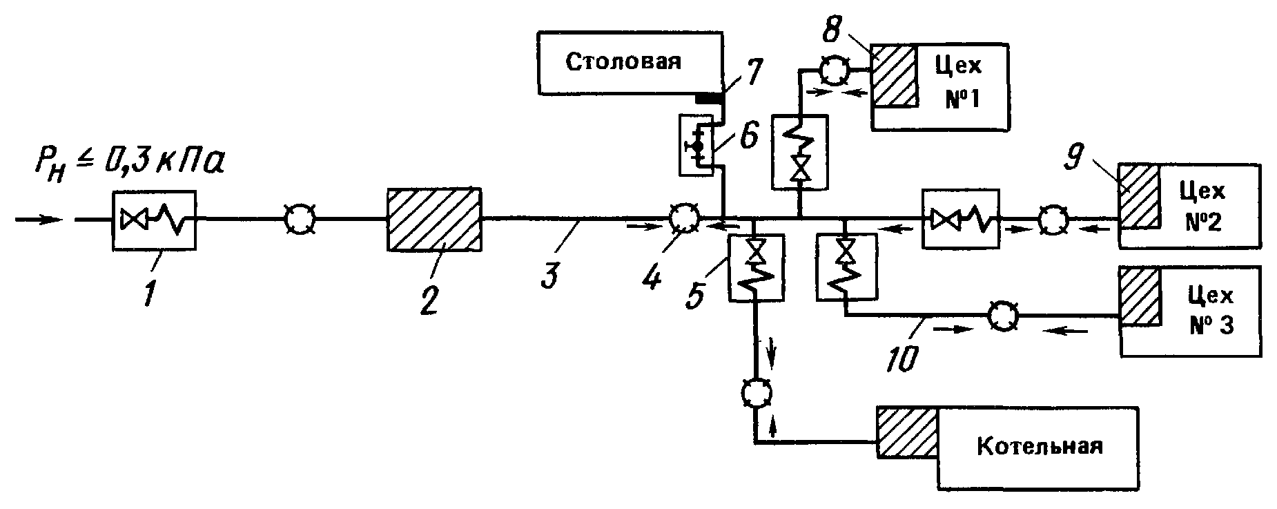 Рис. 1 Схема газоснабжения небольшого промышленного предприятия, присоединенного к городской сети низкого давления