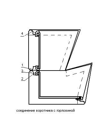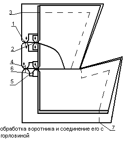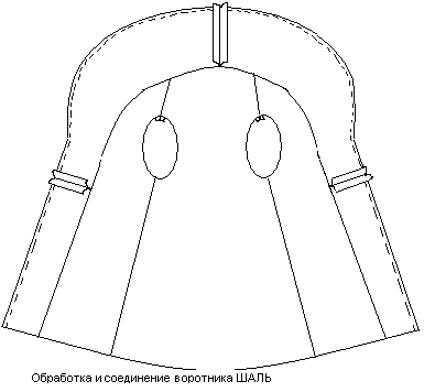 Стачным швом- В.воротник притачивают к подбортам по линии раскепов. Н.воротник втачивают в горловину изделия ш-ш-0,7-1 см, швы раскепов и втачивания н.воротника в горловину разутюживают. В.воротник приметывают к нижнему, притачивают в.воротник к правому подбоорту так же как и к левому, раскепы стачивают со стороны воротника, н.воротник втачивают в горловину со стороны н.воротника, края бортов и воротников выметывают, образуя где нужно кант.