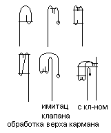 Верхний край кармана обрабатывается в зависимости от формы, прямой - простой подгибкой или листочкой, фигурный – обтачкой, можно настрочить на карман паты, клапаны в зависимости от модели, можно обработать подрезы и складки.