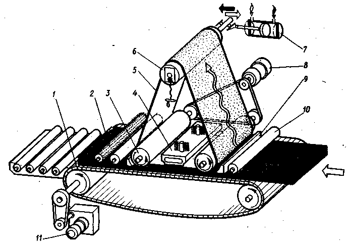 Рис. 5. Одноагрегатный широколенточный шлифовальный станок с конвейерной подачей: 1 — конвейерный механизм подачи, 2 — щетка, 3 — барабан, 4 — утюжок, 5 — шлифовальная лента, 6 — ролик, 7 — пневмоцилиндр, 8, 11 — электродвигатели, 9~ прижим, 10 — прижимный ролик