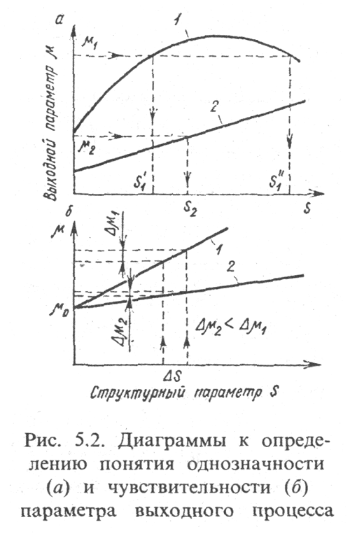 -> быть чувствительным (информативным). Чувствительность характеризуется величиной и скоростью приращения выходного параметра Дц при достаточно малом изменении структурного параметра AS (рис. 5.2, б). Чем больше Ди. при определенном AS, тем выше чувствительность данного параметра выходного процесса;