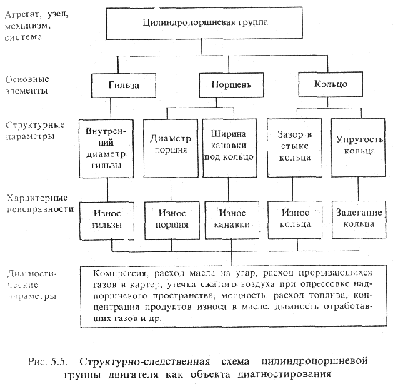 Поэтому при решении задачи выбора диагностических параметров в сложных ситуациях сначала определяют возможный набор параметров. Для этого применяют построение так называемой структурно-следственной схемы узла или механизма, представляющей собой граф-модель, увязывающую в единое целое основные элементы механизма, характеризующие их структурные параметры, перечень характерных неисправностей, подлежащих выявлению, и набор возможных для использования диагностических параметров. Перечень характерных неисправностей механизма составляют на основе статистических оценок показателей его надежности. Пример структурно-следственной схемы цилиндропоршневой группы двигателя приведен на рис. 5.5.