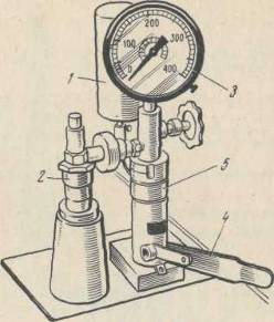 Для проверки качества распыливания топлива необходимо рычагом 4 прибора сделать несколько резких впрысков топлива через форсунку, а затем, качая рычагом 70–80 ходов в минуту, наблюдать за характером впрыска. Если качество распыливания плохое, необходимо отремонтировать или заменить форсунку.