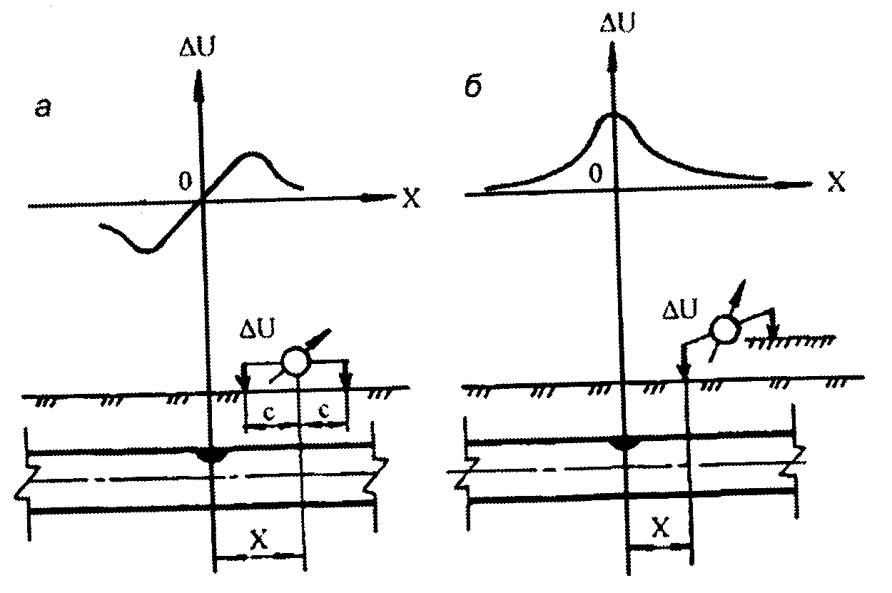 Определение местонахождения сравнительно крупных сквозных повреждений в защитном покрытии подземных трубопроводов основано на измерении падения напряжения на поверхности грунта между двумя электродами, создаваемого током, стекающим с трубы в местах повреждений. Для локализации можно применять постоянный или переменный ток.