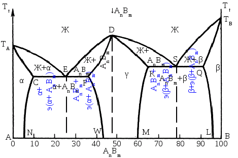 Компоненты в твердом состоянии образую ограниченные твердые растворы, а также растворы на базе химического соединения: α и β на базе А и В, γ на базе А>n>B>n>.