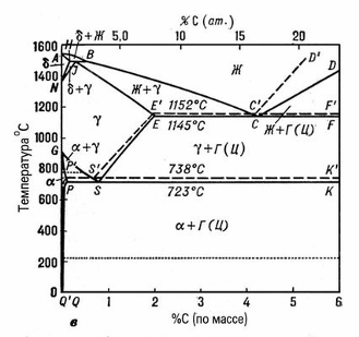В метастабильном состоянии в железоуглеродистые сплавы встречаются a-, g-, d-растворы и карбид железа Fe3C — цементит (Ц). Области устойчивости железоуглеродистых сплавов в однофазных и двухфазных состояниях указаны на диаграммах. При некоторых условиях в железоуглеродистых сплавах могут существовать в равновесии и три фазы. При температурах НВ возможно перитектическое равновесие d + g + Ж, E’C’F’ — эвтектическое стабильное равновесие g + Ж + Г; при ECF — эвтектическое метастабильное равновесие g + Ж + Ц; при P'S'K' — эвтектоидное стабильное равновесие a + g + Г', при PSK — эвтектоидное метастабильное равновесие a + g + Ц.
