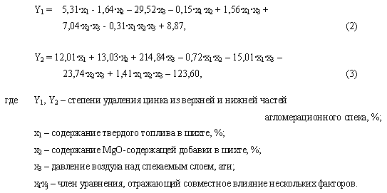 Расчет степени удаления цинка проводили раздельно для верхней и нижней частей агломерационного спека. Удаление цинка из верхнего слоя составляет 40…73 % и значительно превышает данный показатель для нижнего (20…63 %). Совокупное влияние факторов на степень удаления цинка аппроксимировано функциями отклика вида:
